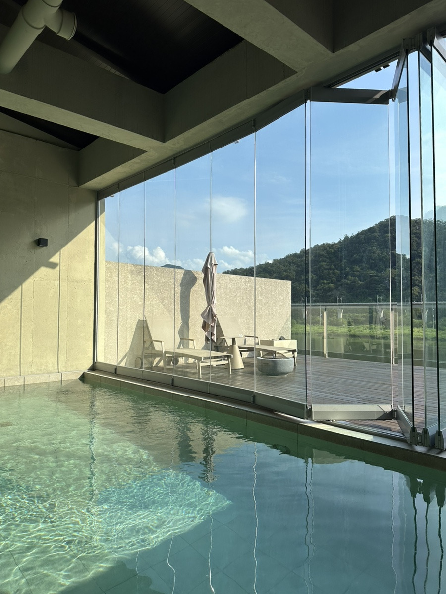 물뭍은 가평에 위치한 펜션이고 조식 제공, 날씨에 관계없이 풀빌라 이용가능(야외 X, 통유리로 위에 지붕이 있음), 온수제공(온수비용추가+9만 원)이라는 장점이 있습니다. 조식이 진짜 맛있어요.
